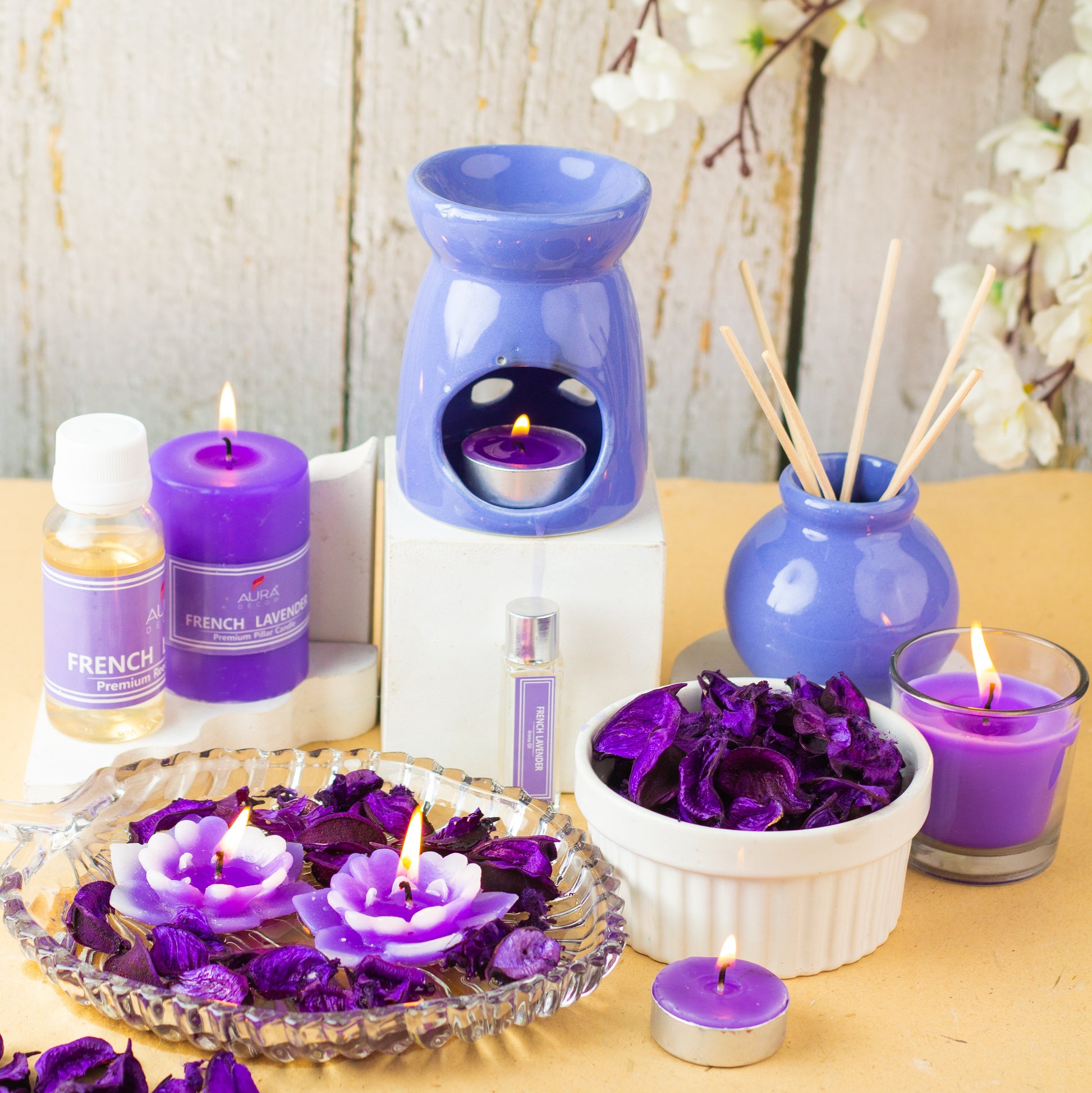 Combo Gift Pack for Aroma theraphy, Includes ( Pillar Candle, Votive, Reed Diffuser, Potpourri, 2 Floating Candles, Fragrance, Diffuser, Reed Sticks, 2 Tealight Candles, )