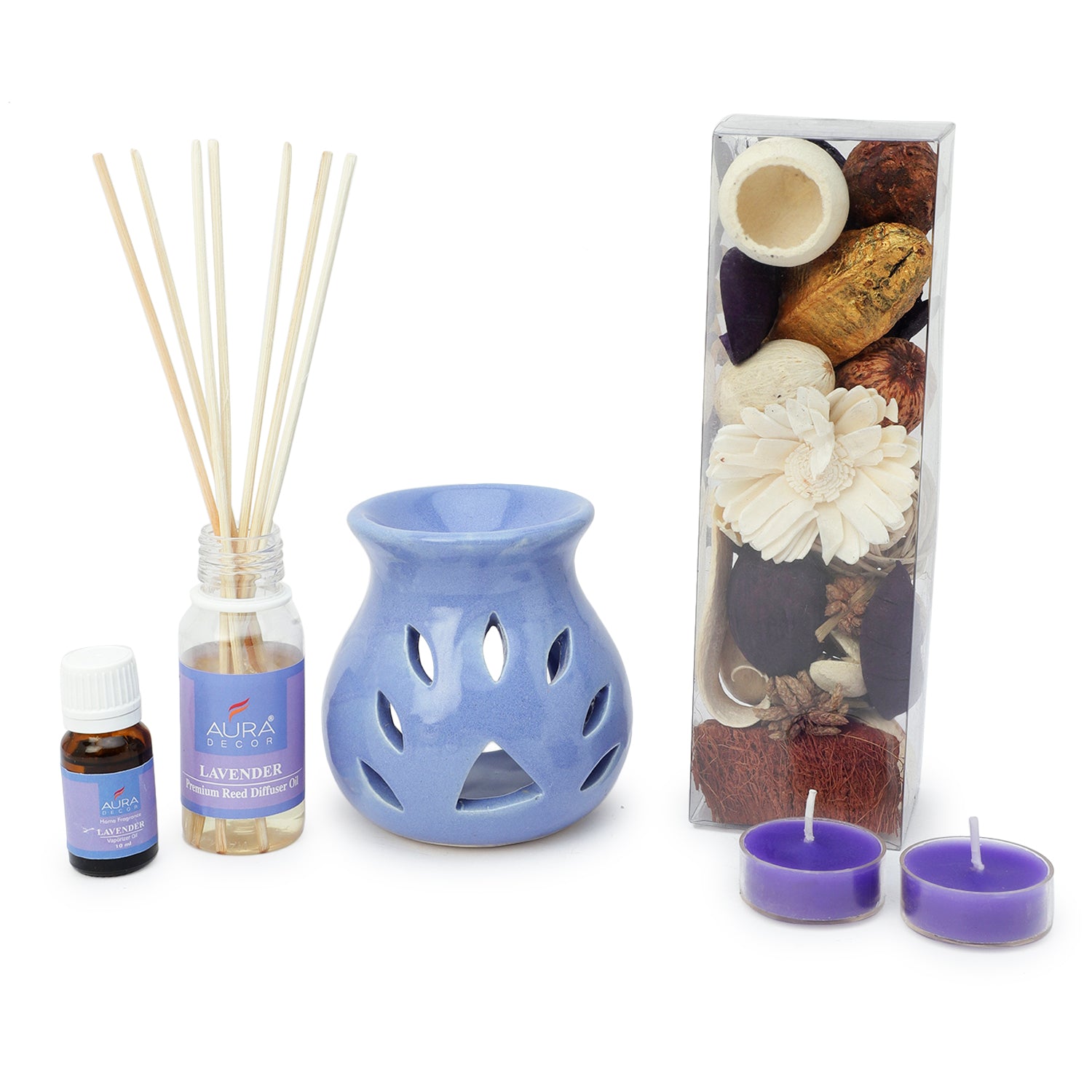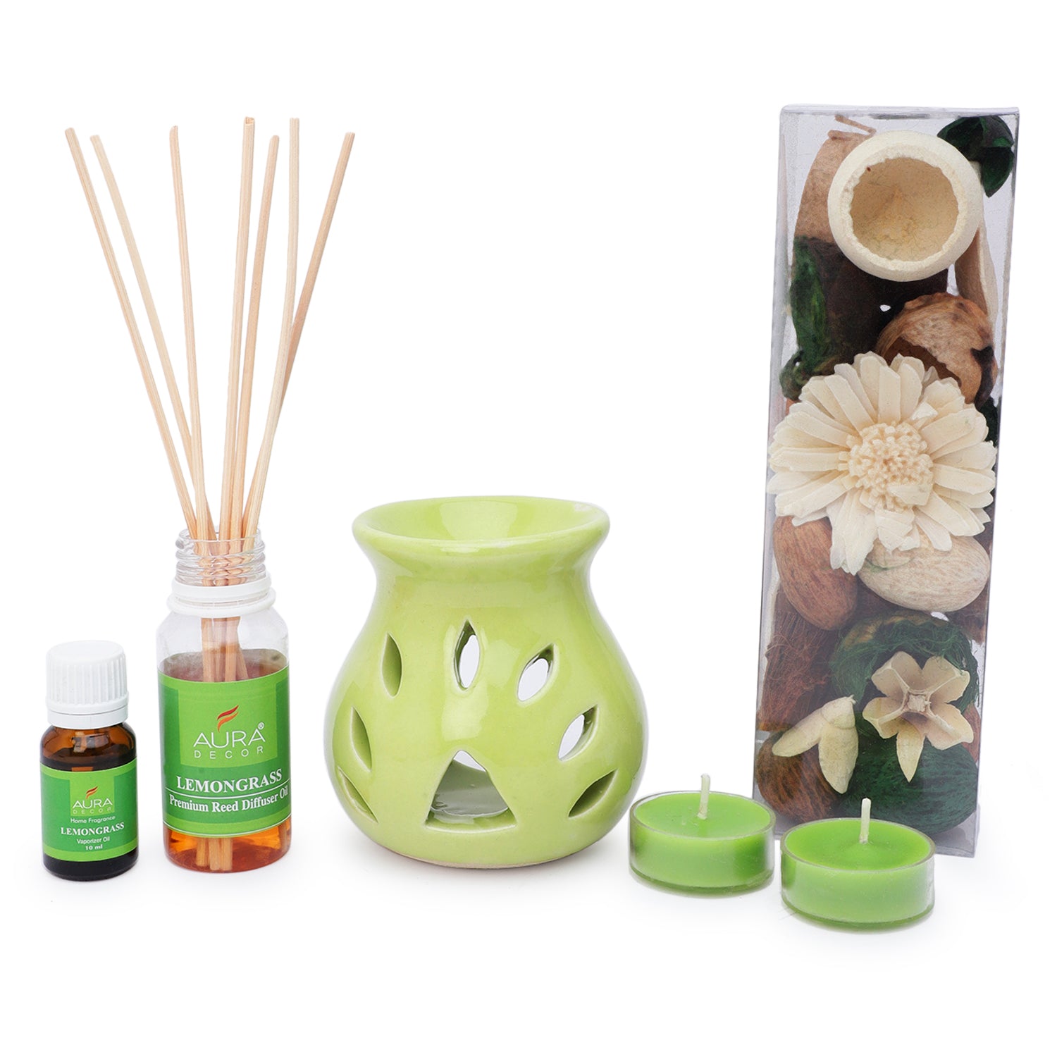 Enhance your space with the calming and invigorating scents of AuraDecor's Aromatherapy Gift Set. Perfect for relaxation and creating a soothing atmosphere, this gift set is available in three delightful fragrances: Rose, Lavender, and Lemongrass.