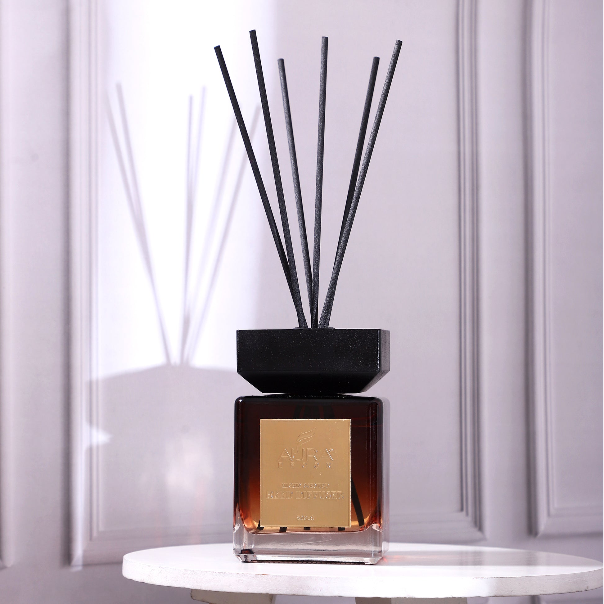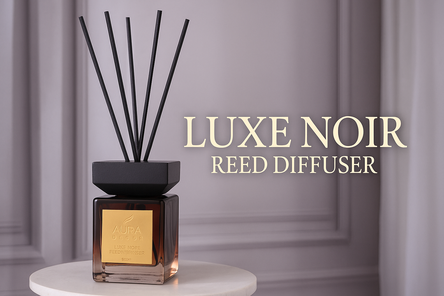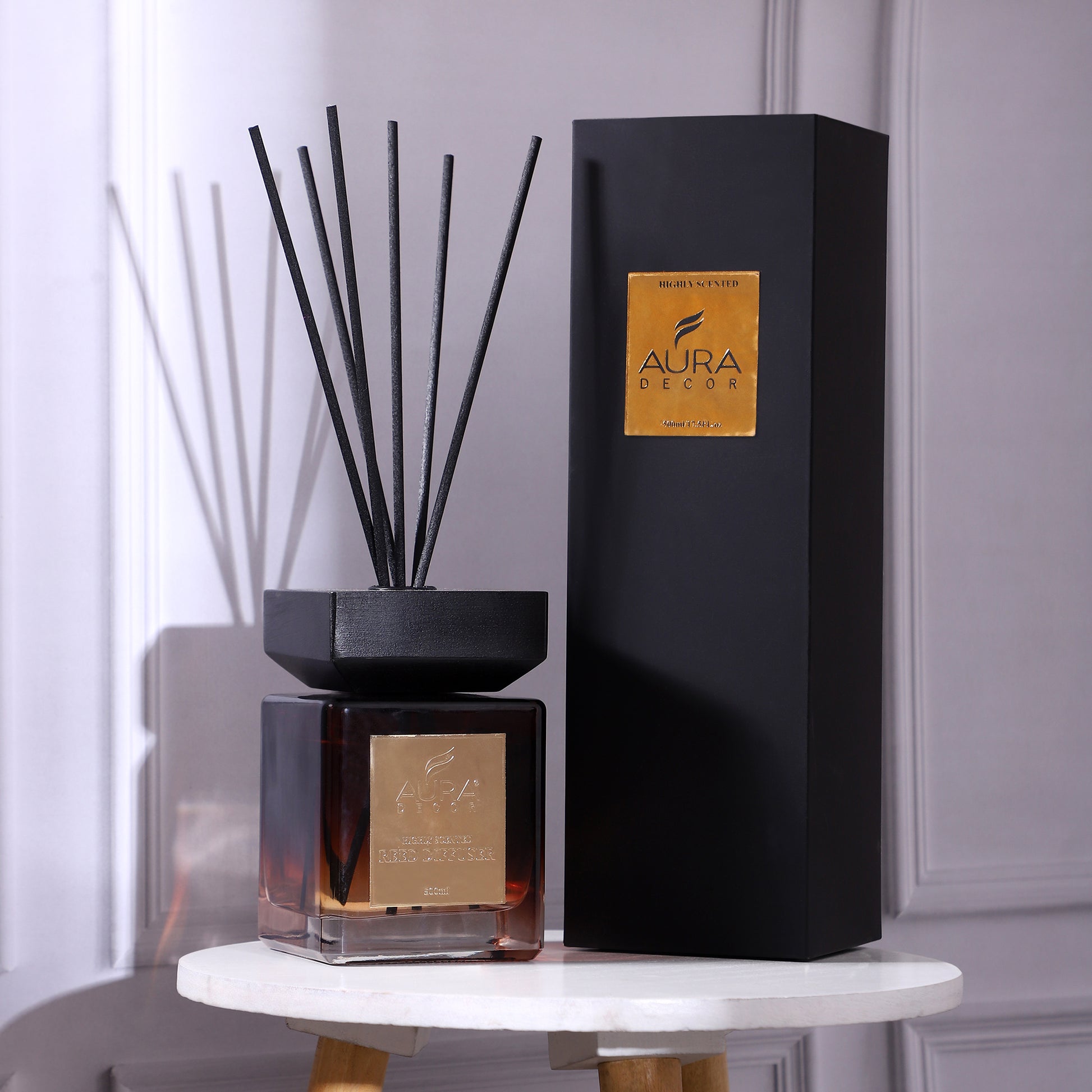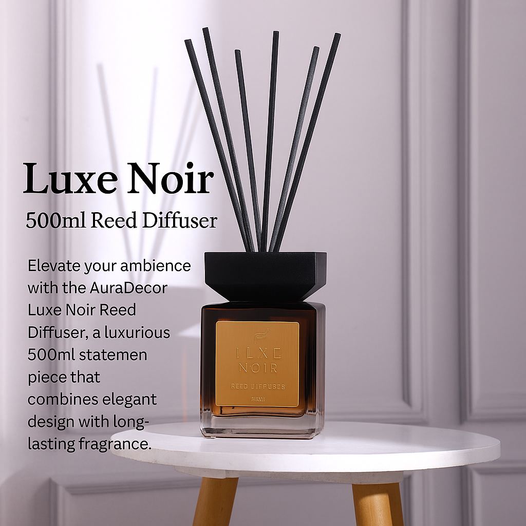 Elevate your ambience with the AuraDecor Luxe Noir Reed Diffuser, a luxurious 500ml statement piece that combines elegant design with long-lasting fragrance. Infused with premium scent oils, this highly scented diffuser releases a soothing aroma that revitalizes any room ideal for homes, offices, or gifting. Featuring minimalist black reeds and a deep amber glass bottle with gold detailing, it blends sophistication and functionality to create a truly aromatic experience, all day long.