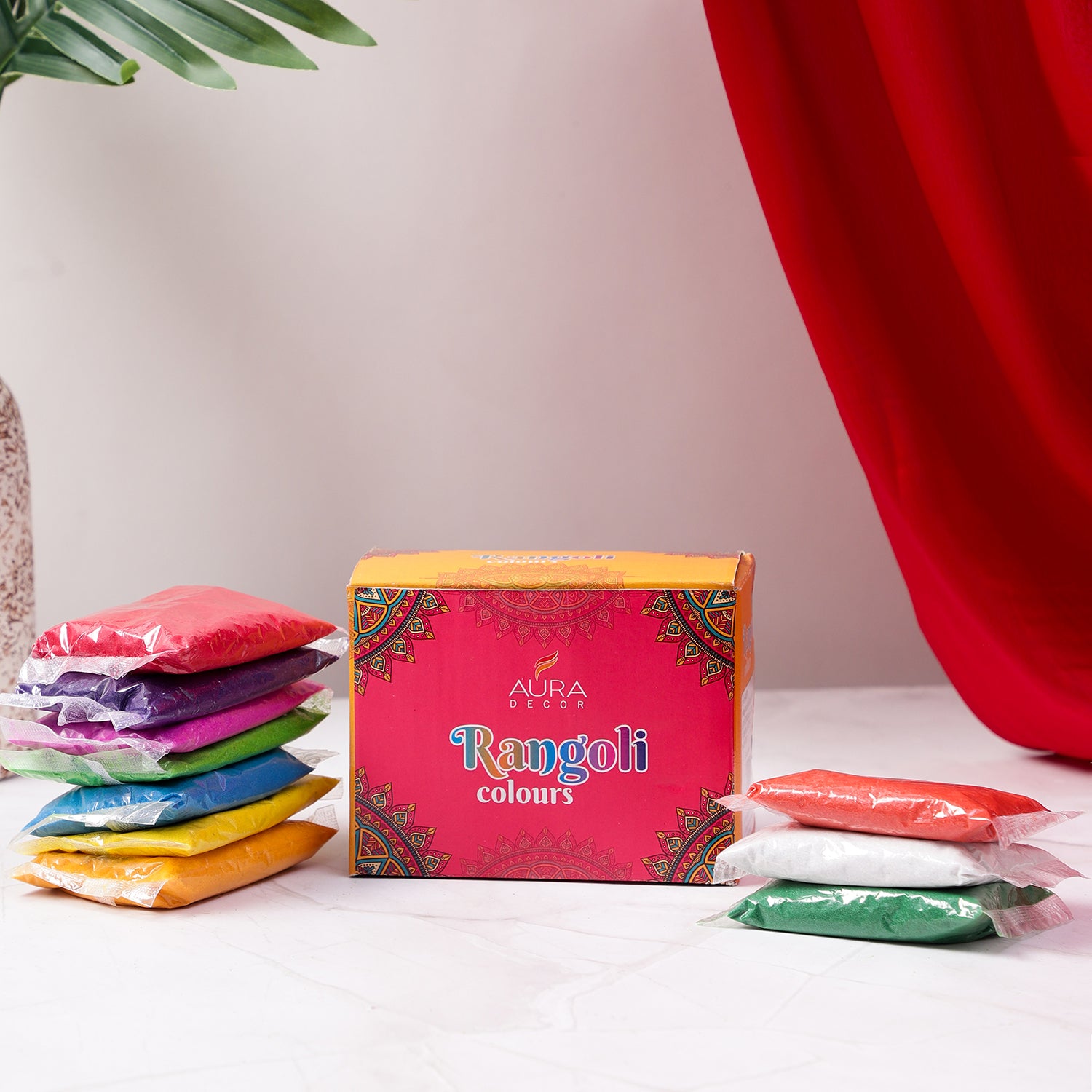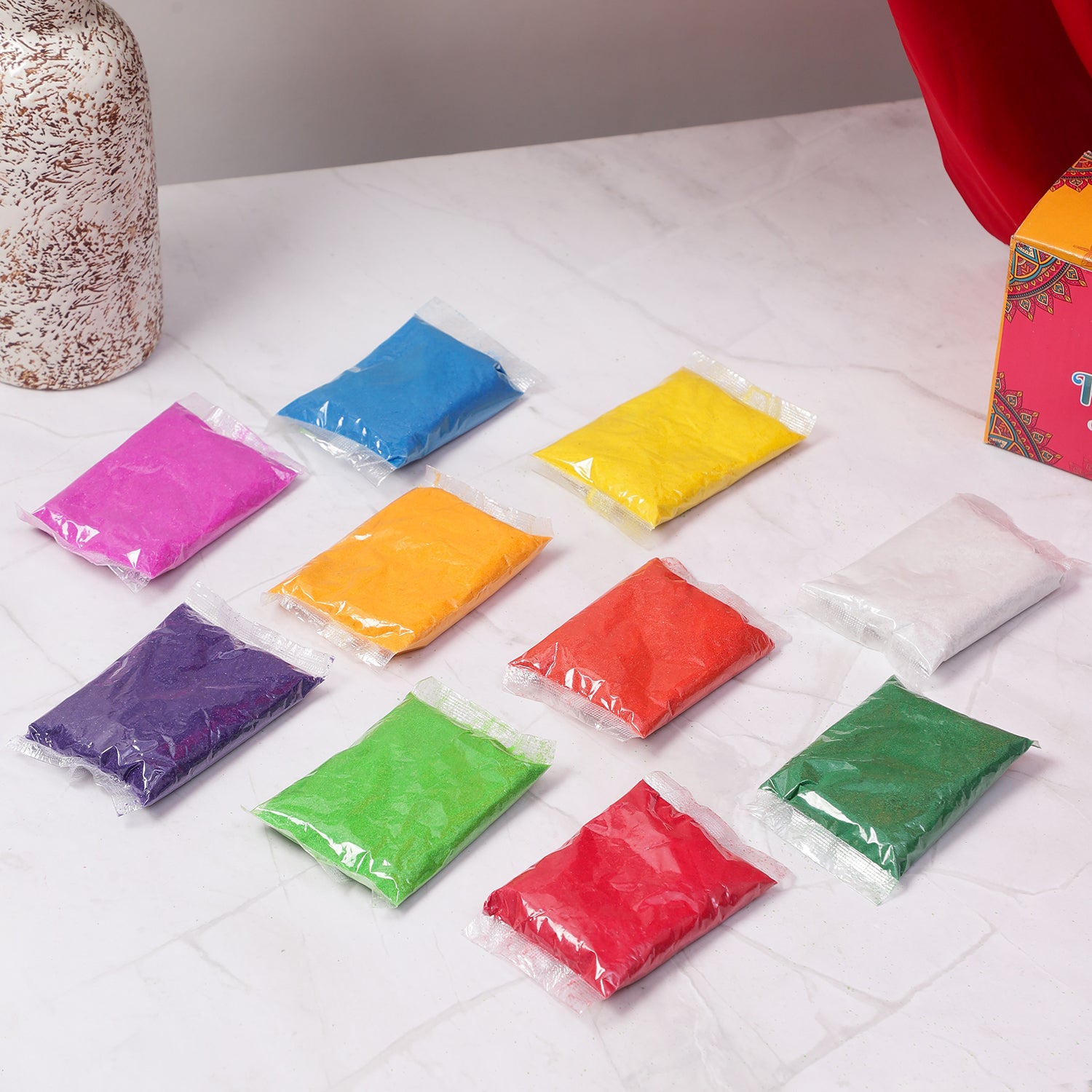 Rangoli Colours Set, featuring 10 rich and vivid hues. Each color is carefully selected to help you create stunning Rangoli designs that reflect the joy and spirit of any occasion. Whether you're decorating for a festival, or wedding, or simply adding a festive touch to your home, this set offers the perfect palette for your creativity. The fine, easy-to-use powders ensure smooth, intricate designs that stay bright and beautiful throughout the celebration.