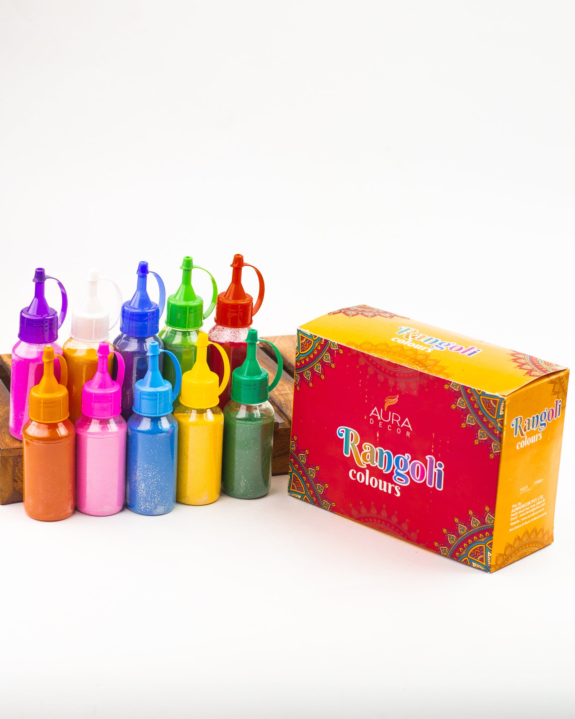 - 𝗣𝗮𝗰𝗸𝗮𝗴𝗲 𝗖𝗼𝗻𝘁𝗲𝗻𝘁𝘀 : This set includes 10 assorted vibrant Rangoli colours, providing you with a wide range of options for your creative Rangoli designs. This set includes 10 different vibrant and assorted colours. Ensuring your rangoli designs stand out and catch the eye.